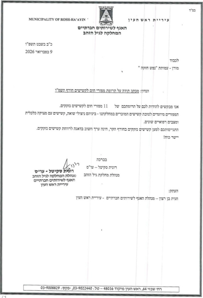 לקראת מזג האוויר הסוער והחורפי, חילקנו מפזרי חום לקשישים ונזקקים, המוכרים במחלקת הרווחה וביניהם ניצולי שואה, קשישים נזקקים וחולים. מפזרי החום הועברו ישירות אל הנזקקים והתגובות שקיבלנו חיממו לנו את הלב ❤️